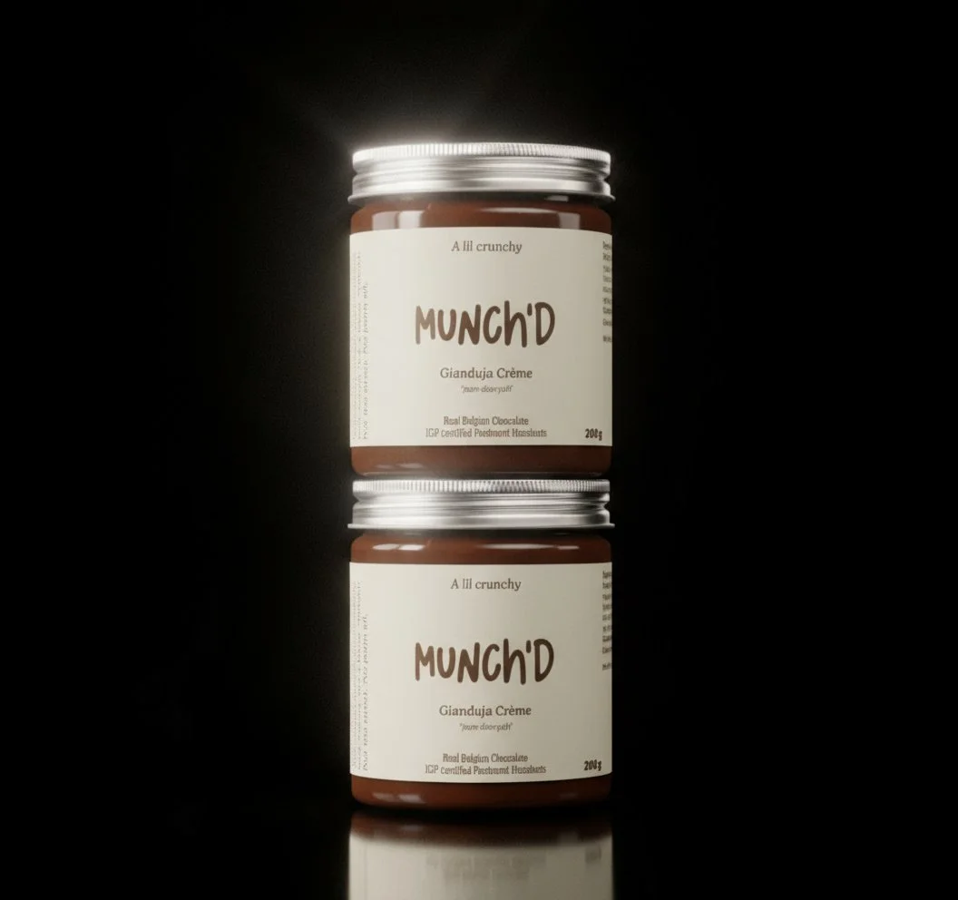 Real chocolate meetsthe finest hazelnuts on Earth “The World’s Most Decadent Spread” 4.7/5 147 reviews Shop Now This is Gianduja (in a jar) say it: ‘jhan-doo-ya’ Real Chocolate No Palm Oil IGP Piedmont Hazelnuts Why Munch’d? We were sick of spreads filled with sugar, palm oil and cocoa powder. We wanted something real. So, we made Munch’d. Sold Out Munch'd Gianduja Crème Add to Cart i need a sweet treat merch Wear it Shop Over 147 reviews, But here are our favs “I was so surprised it tasted nothing like N*tella.”@thebrunchcrawlers - 5/5 “It melts as soon as it hits my tongue… OMG”@ali.yussufow - 5/5